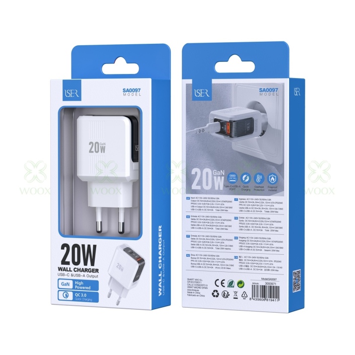 ISER SA0097 CARCADOR 2 PUERTOS QC3.0 TYPE-C/USB-A GAN HIGH POWERED 20W BLANCO