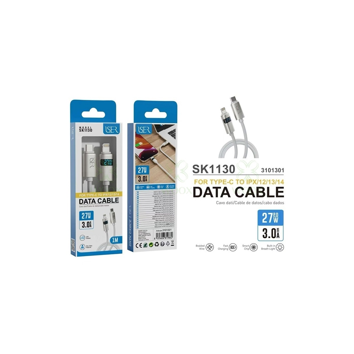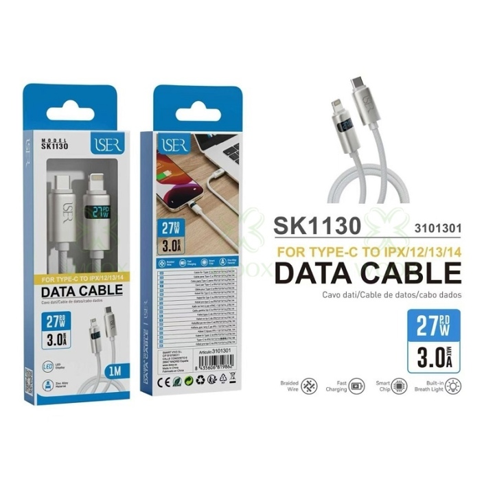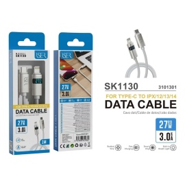 ISER SK1130 CABLE TRENZADO DE CARGA RAPIDA CON LED PD TYPE-C TO LIGHTNING 27W 3.0A 1M BLANCO