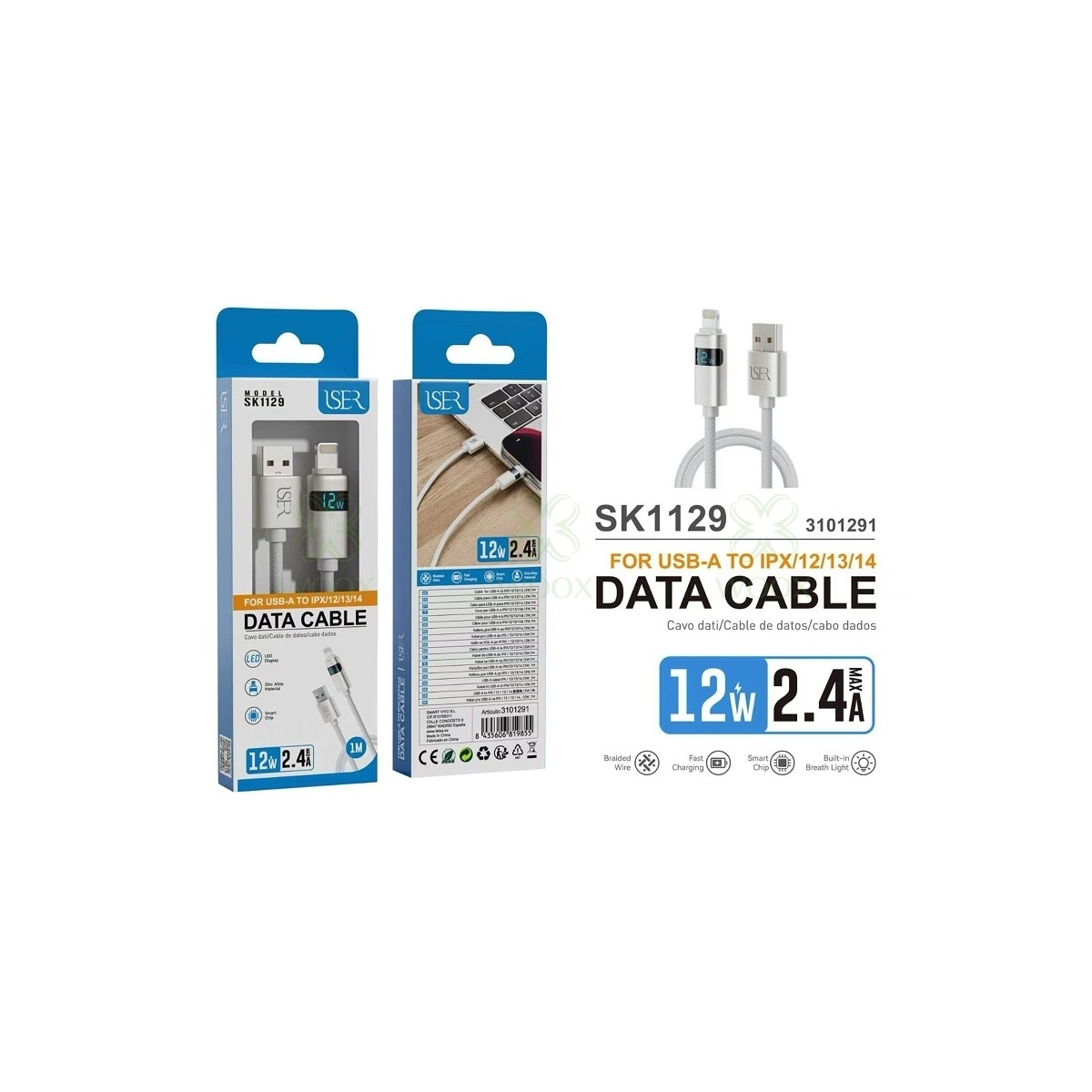 ISER SK1129 CABLE TRENZADO DE CARGA RAPIDA CON LED PD USB-A TO LIGHTNING 12W 2.4A 1M BLANCO