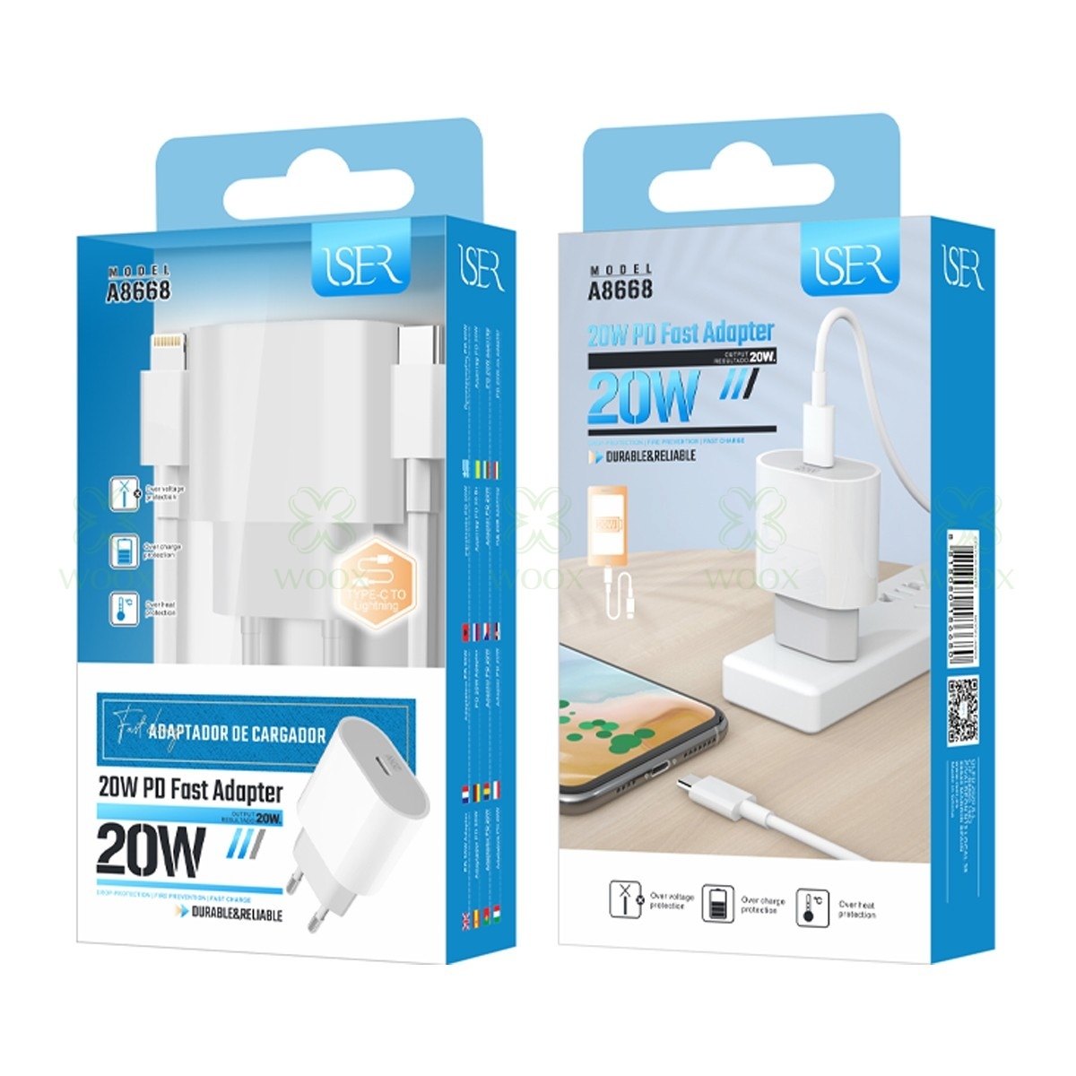 ISER A8668 CARGADOR RÁPIDO PD CON CABLE TYPE-C TO LIGHTNING 20W BLANCO