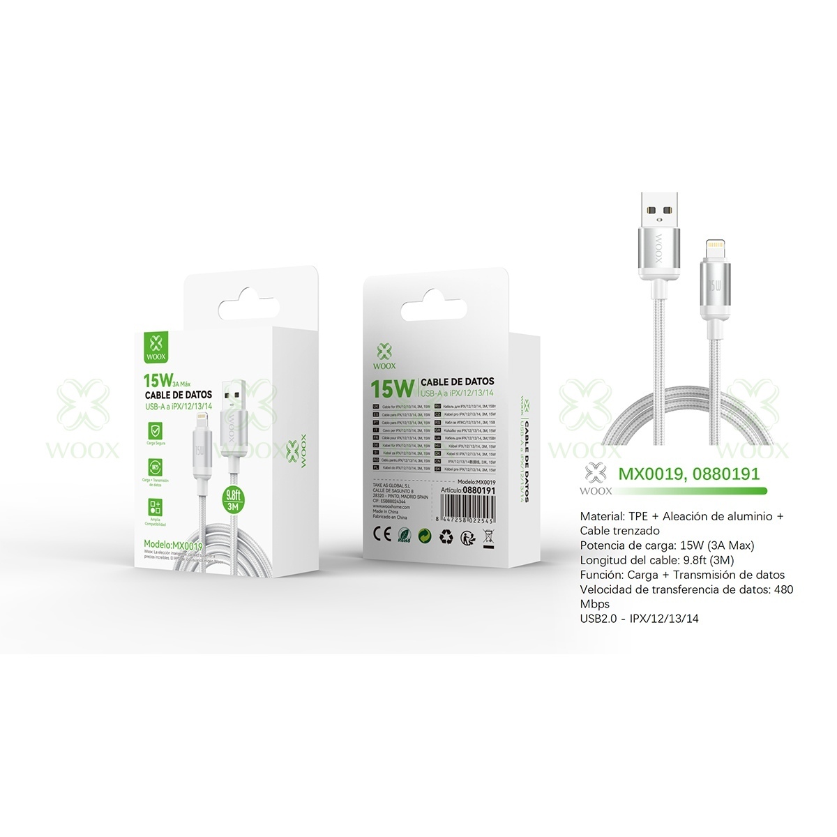 WOOX MX0019 CABLE DE DATOS USB TO LIGHTNING 15W 3M BLANCO