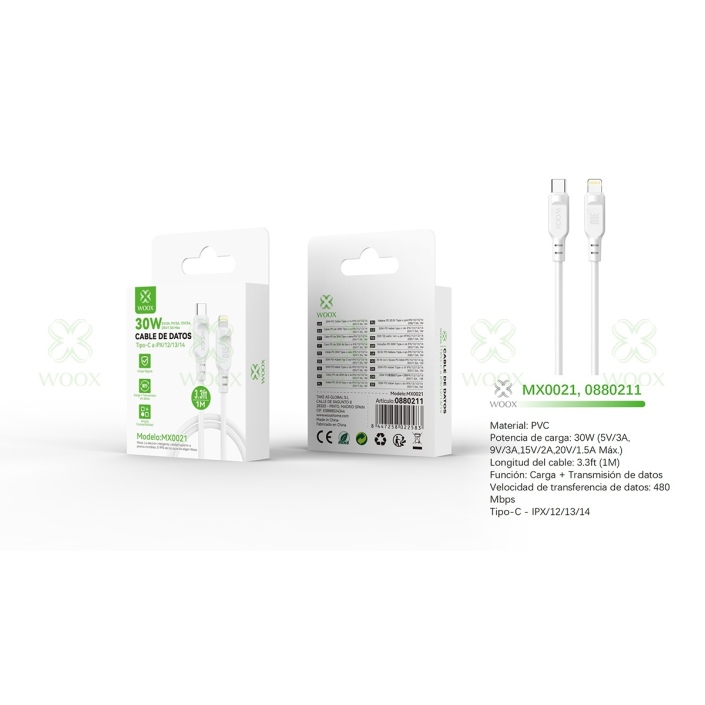 WOOX MX0021 CABLE DE DATOS TYPE-C TO LIGHTNING 30W 1M BLANCO