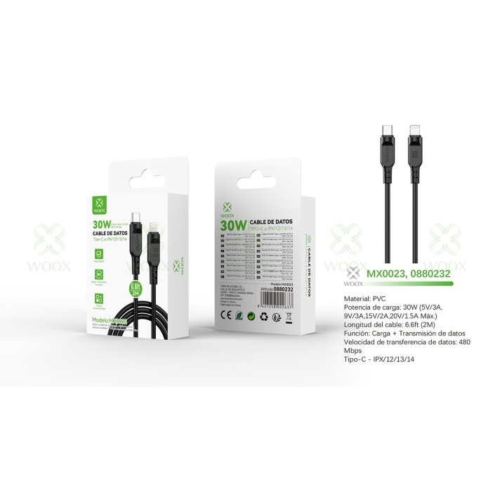 WOOX MX0023 CABLE DE DATOS TYPE-C TO LIGHTNING 30W 2M NEGRO