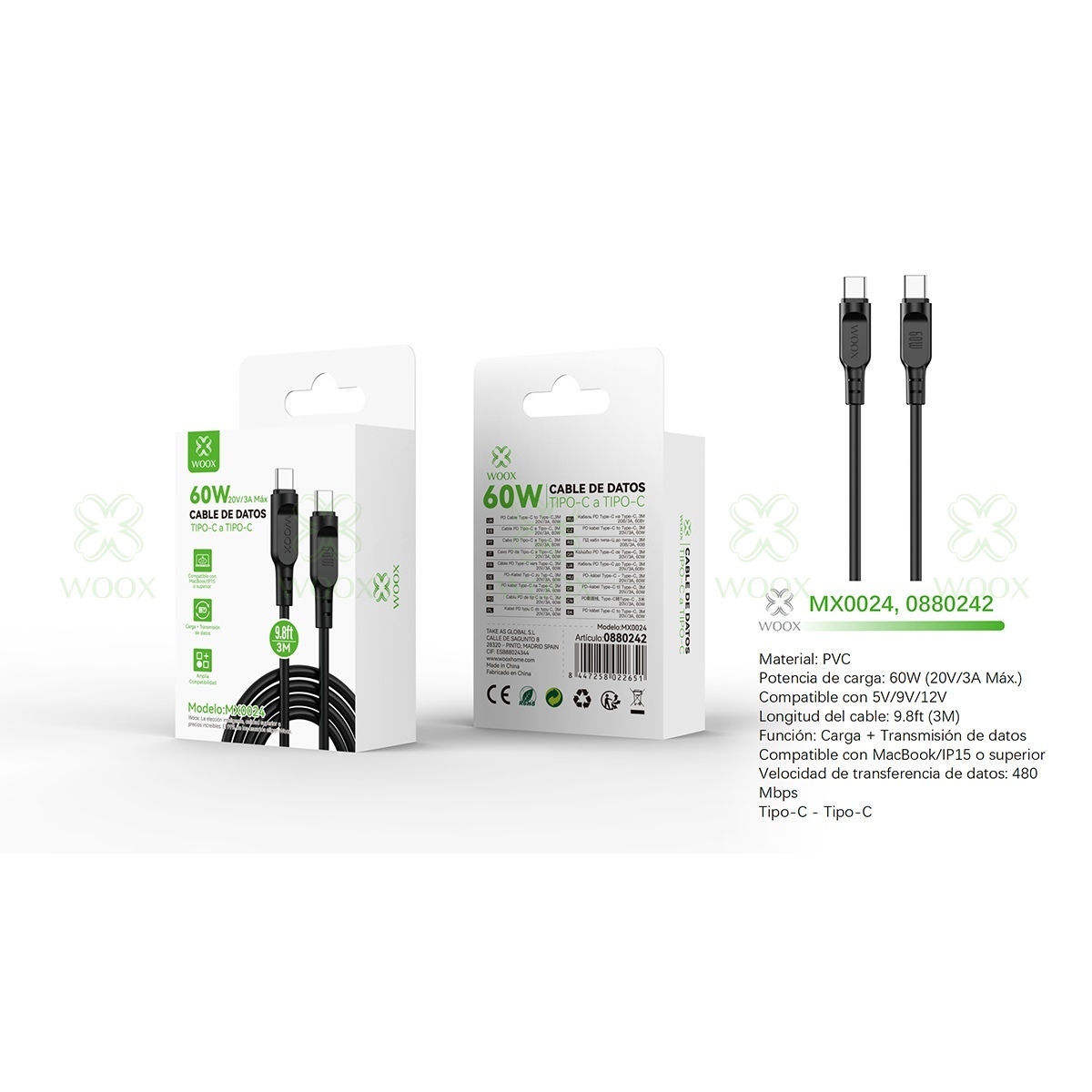 Cable de Datos MX0024 Type-C to Type-C 60W 3m-Negro