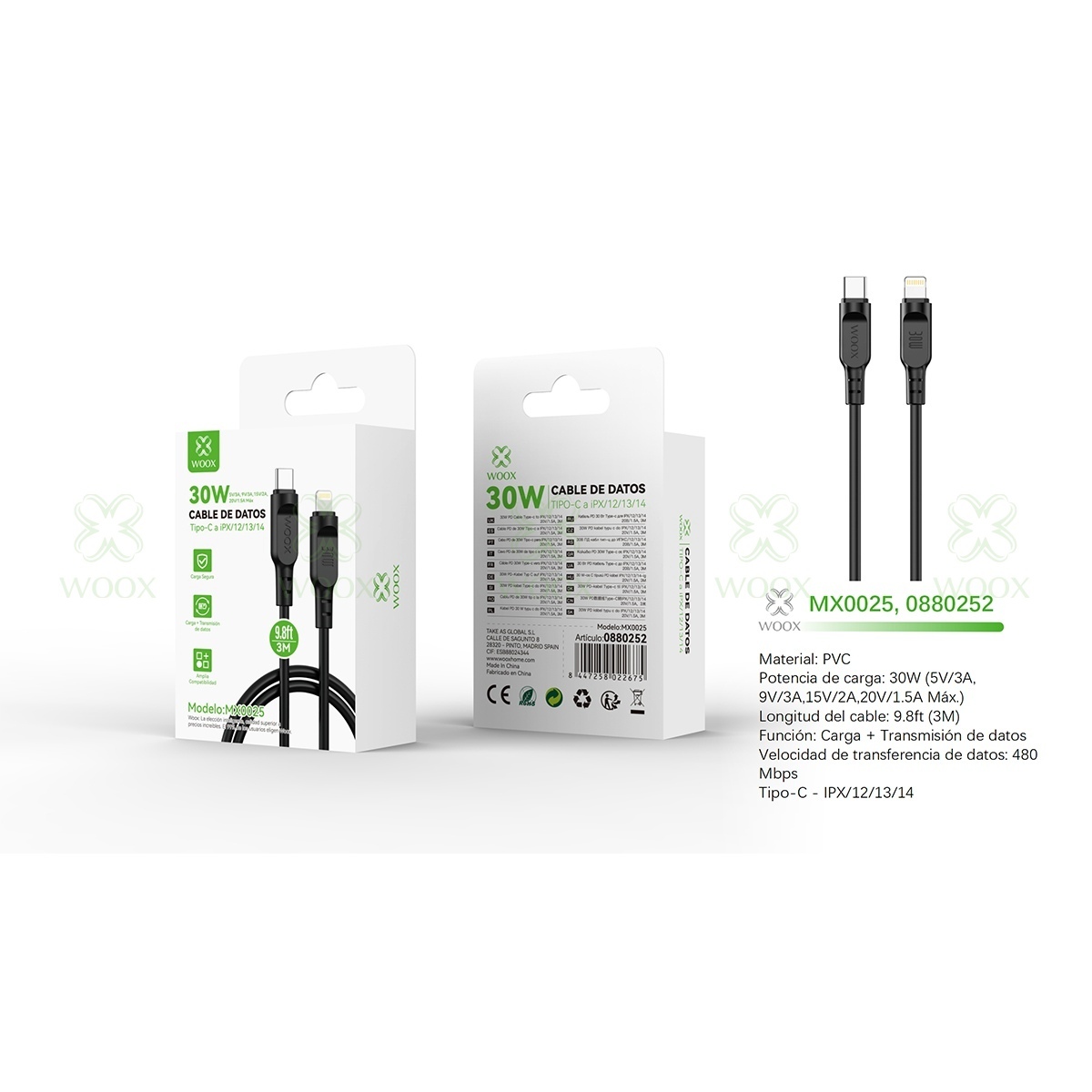 WOOX MX0025 CABLE DE DATOS TYPE-C TO LIGHTNING 30W 3M NEGRO