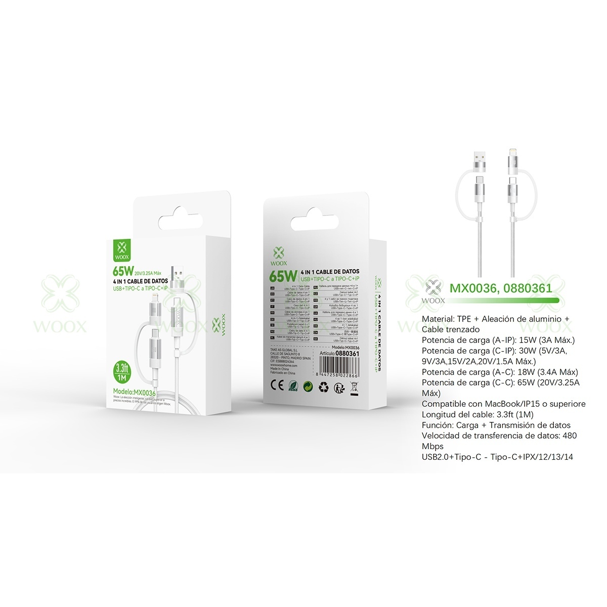 WOOX MX0036 4 IN 1 CABLE DE DATOS USB+TYPE-C TO TYPE-C+LIGHTNING 3A 1M BLANCO
