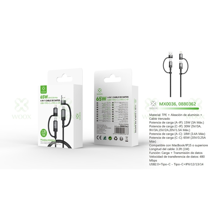 4 IN 1Cable de Datos MX0036 USB+Type-C TO Type-C+ Lightning 3A 1m-Negro
