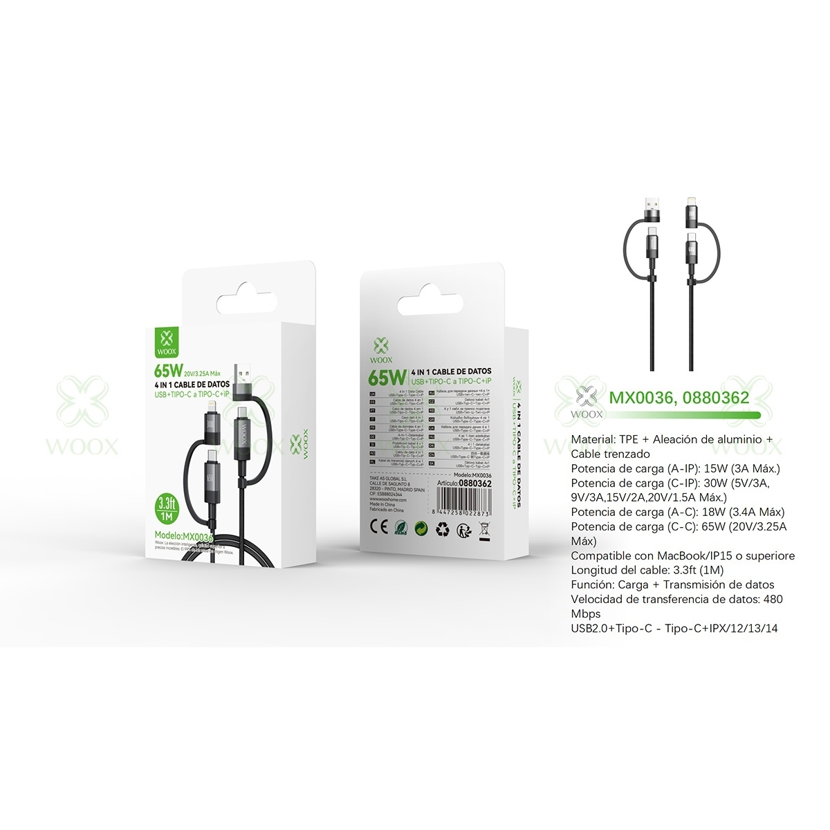 WOOX MX0036 4 IN 1 CABLE DE DATOS USB+TYPE-C TO TYPE-C+LIGHTNING 3A 1M NEGRO