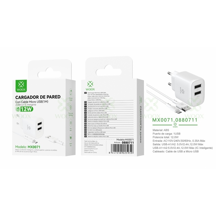WOOX MX0071 ADAPTADOR DE 2 PUERTOS USB CON CABLE MICRO USB 5V/2.4A (1M) BLANCO