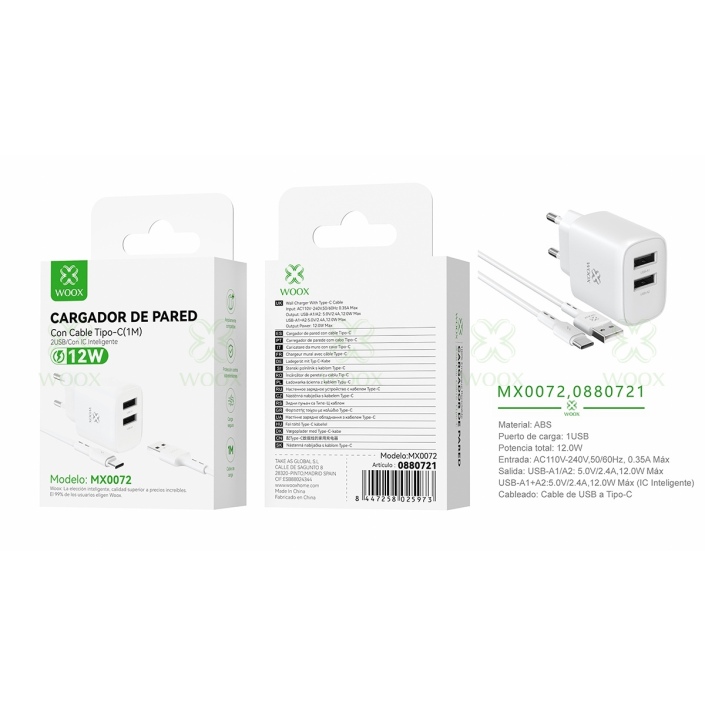 WOOX MX0072 ADAPTADOR DE 2 PUERTOS USB CON CABLE USB TO TYPE C (1M) 5V/2.4A BLANCO
