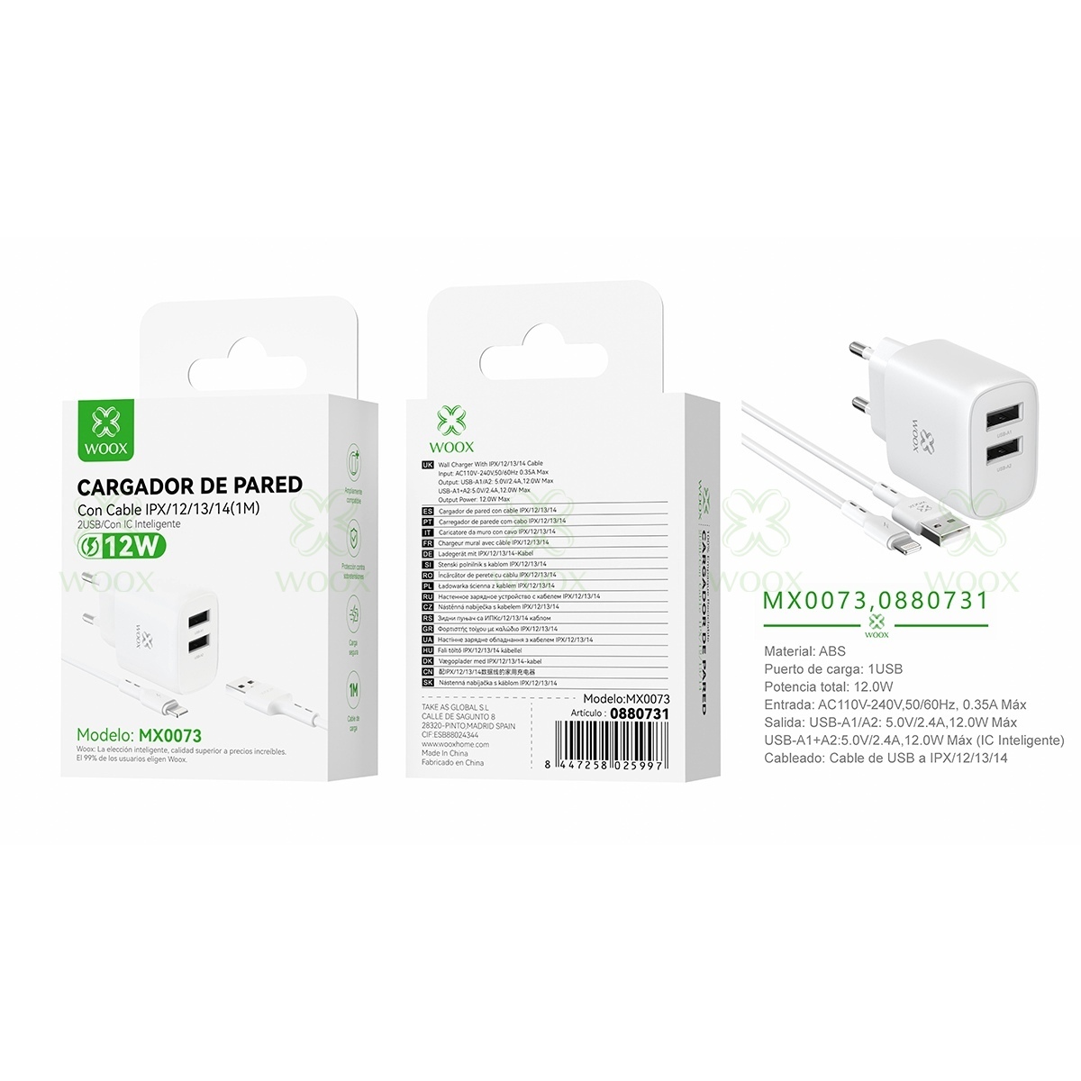 WOOX MX0073 ADAPTADOR DE 2 PUERTOS USB CON CABLE USB TO LIGHTNING (1M) 5V/2.4A BLANCO