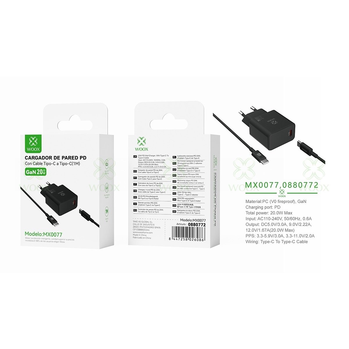 WOOX MX0077 ADAPTADOR USB C CON CABLE TYPE C TO TYPE C (1M) 20W NEGRO