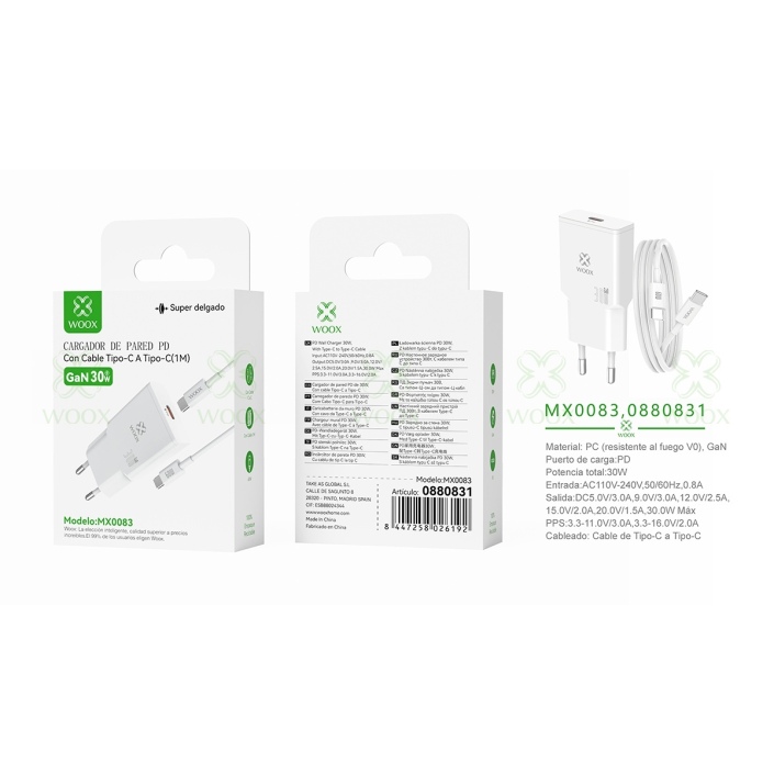WOOX MX0083 ADAPTADOR USB C CON CABLE TYPE C TO TYPE C (1M) 30W BLANCO