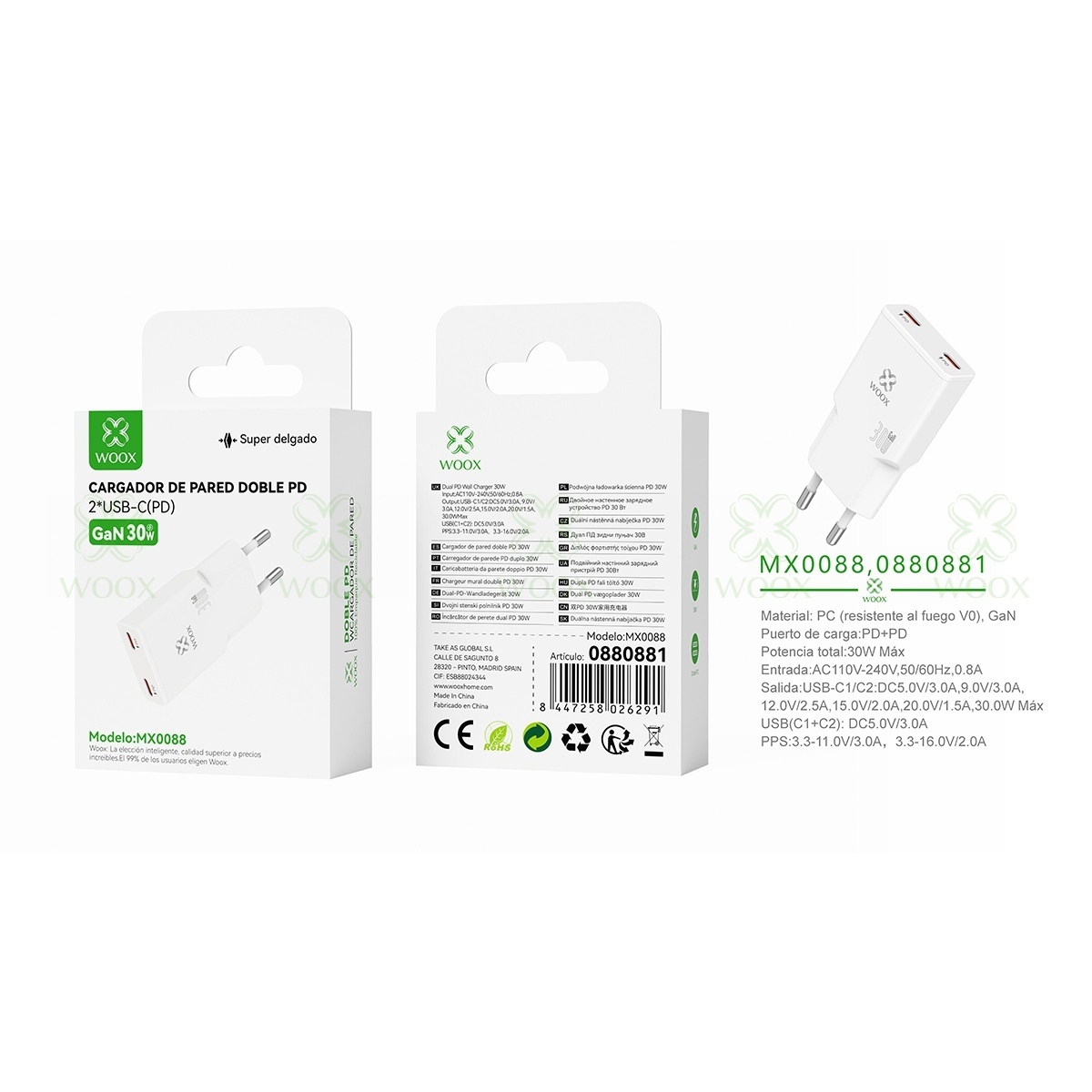 WOOX MX0088 ADAPTADOR CON 2 PUERTOS USB C*2 30W BLANCO