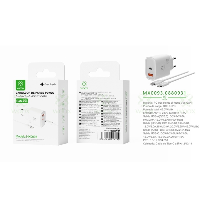 WOOX MX0093 ADAPTADOR DE 2 PUERTOS USB/USB-C CON CABLE TYPE-C TO LIGHTNING (1M) 45W BLANCO
