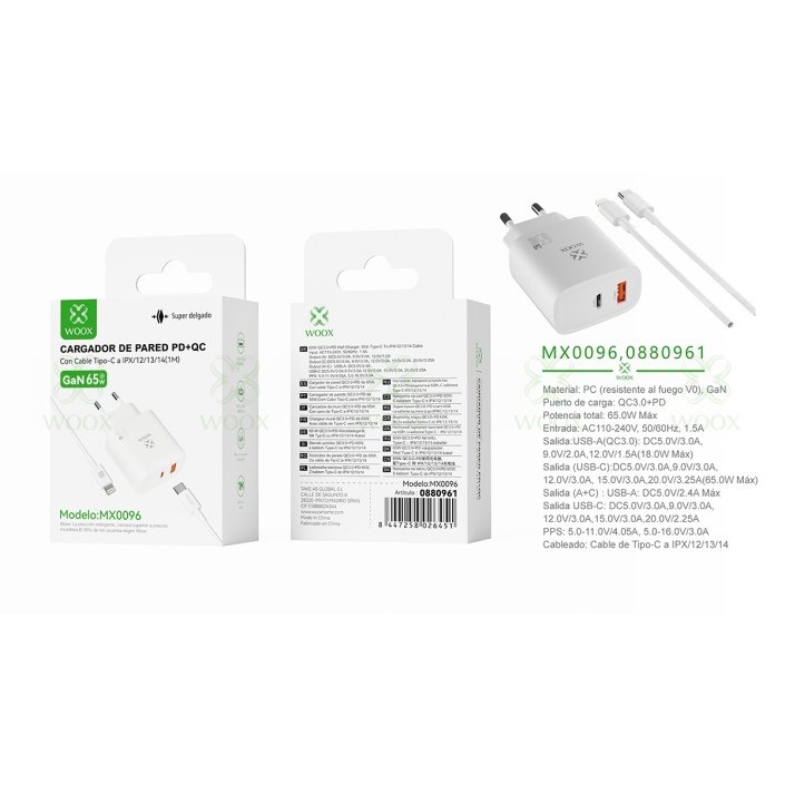 WOOX MX0096 ADAPTADOR DE 2 PUERTOS USB/USB-C CON CABLE TYPE-C TO LIGHTNING (1M) 65W BLANCO