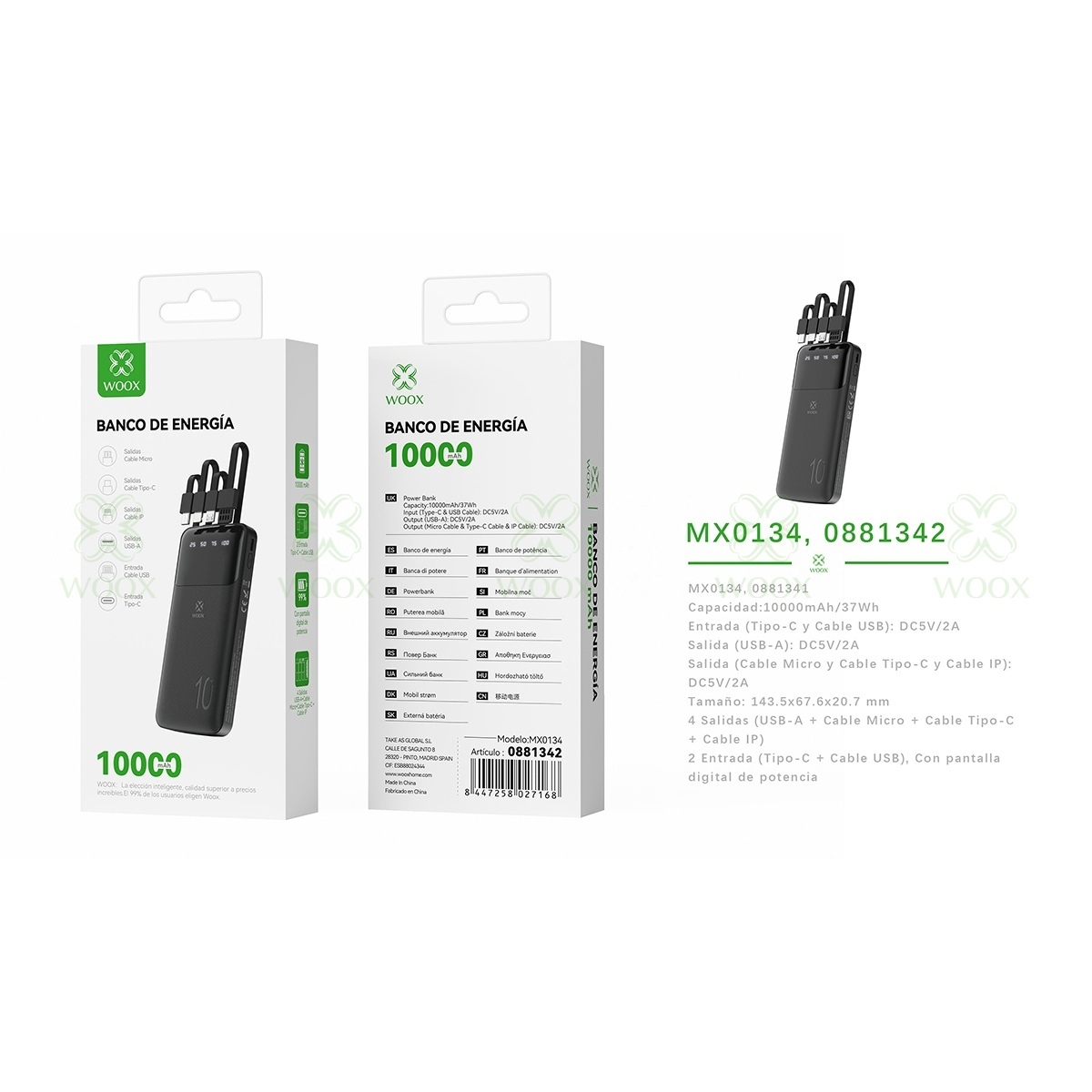 WOOX MX0134 POWER BANK INALAMBRICO CON 4 CABLE (MICRO+TYPE-C+LIGHTNING+USB) 10000MAH 5V2A NEGRO