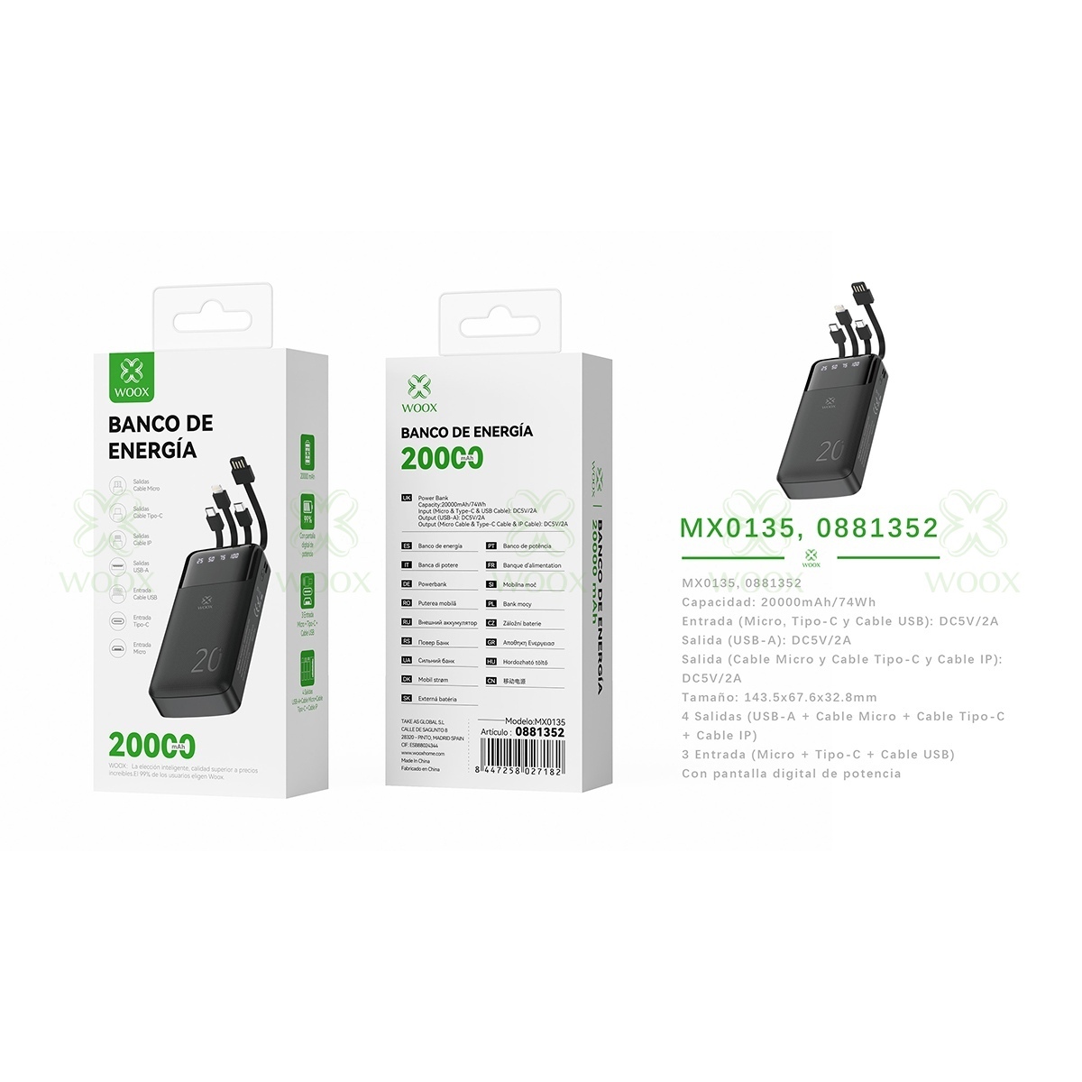 WOOX MX0135 POWER BANK INALAMBRICO CON 4 CABLE (MICRO+TYPE-C+LIGHTNING+USB) 20000MAH 5V2A NEGRO