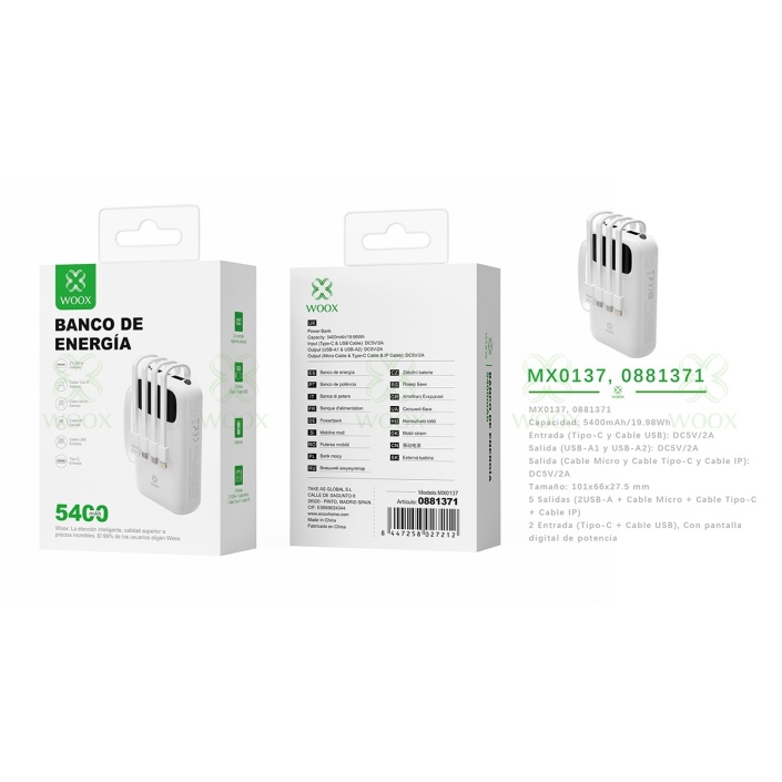 WOOX MX0137 POWER BANK INALAMBRICO CON 4 CABLE (MICRO+TYPE-C+LIGHTNING+USB) 5400MAH 5V2A BLANCO