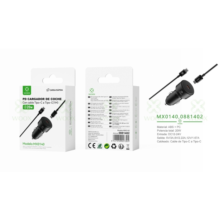 WOOX MX0140 CARGADOR RAPIDO PARA COCHE USB-C CON CABLE TYPE-C TO TYPE-C (1M) 20W NEGRO