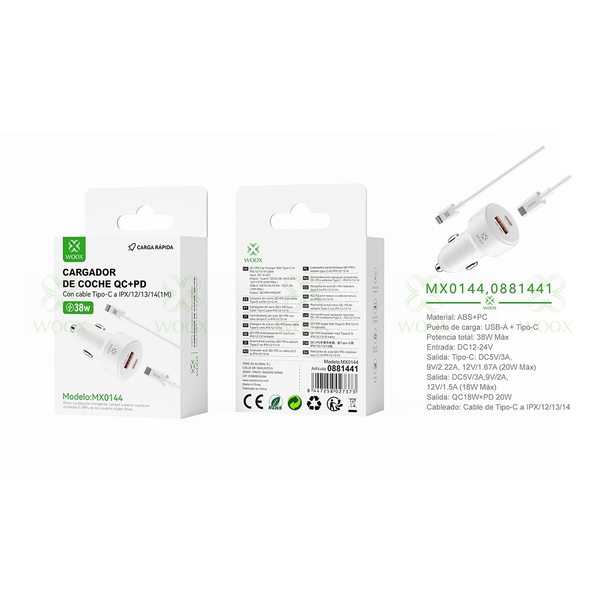 WOOX MX0144 CARGADOR CARGA RAPIDA PARA COCHE DE 2 PUERTOS USB+USB-C CON CABLE TYPE-C TO LIGHTNING (1M) 38W BLANCO