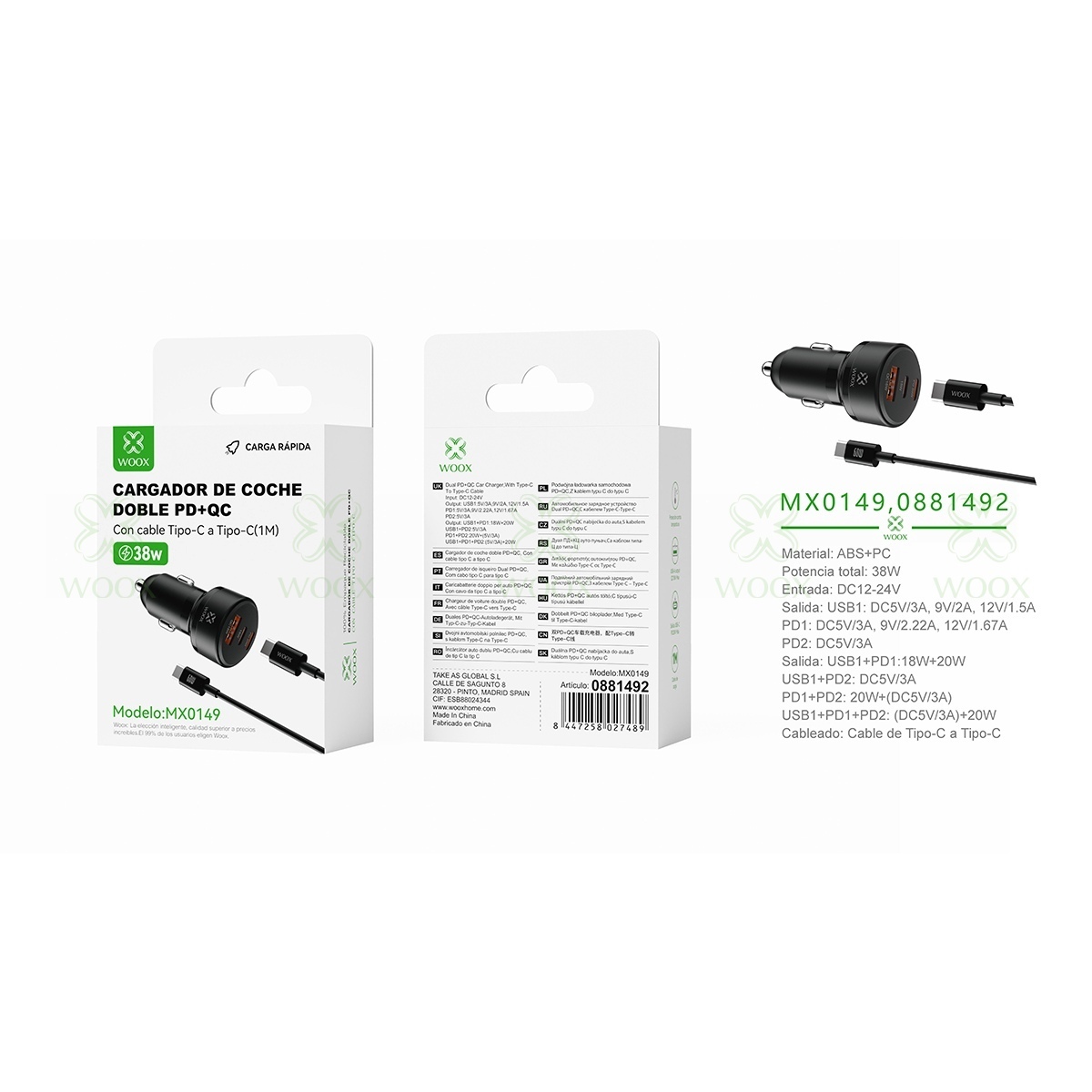 WOOX MX0149 CARGADOR CARGA RAPIDA PARA COCHE DE 3 PUERTOS USB+USB-C*2 CON CABLE TYPE-C TO TYPE-C (1M) 38W NEGRO