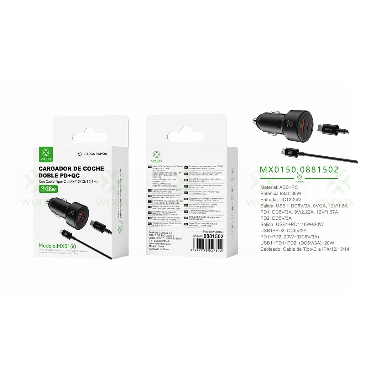 WOOX MX0150 CARGADOR CARGA RAPIDA PARA COCHE DE 3 PUERTOS USB+USB-C*2 CON CABLE TYPE-C TO LIGHTNING (1M) 38W NEGRO