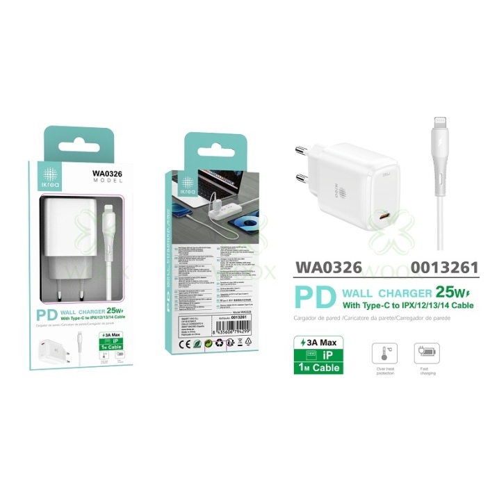 IKREA WA0326 CARGADOR PD CON CABLE TYPE-C TO LIGHTNING 25W 3A MAX BLANCO
