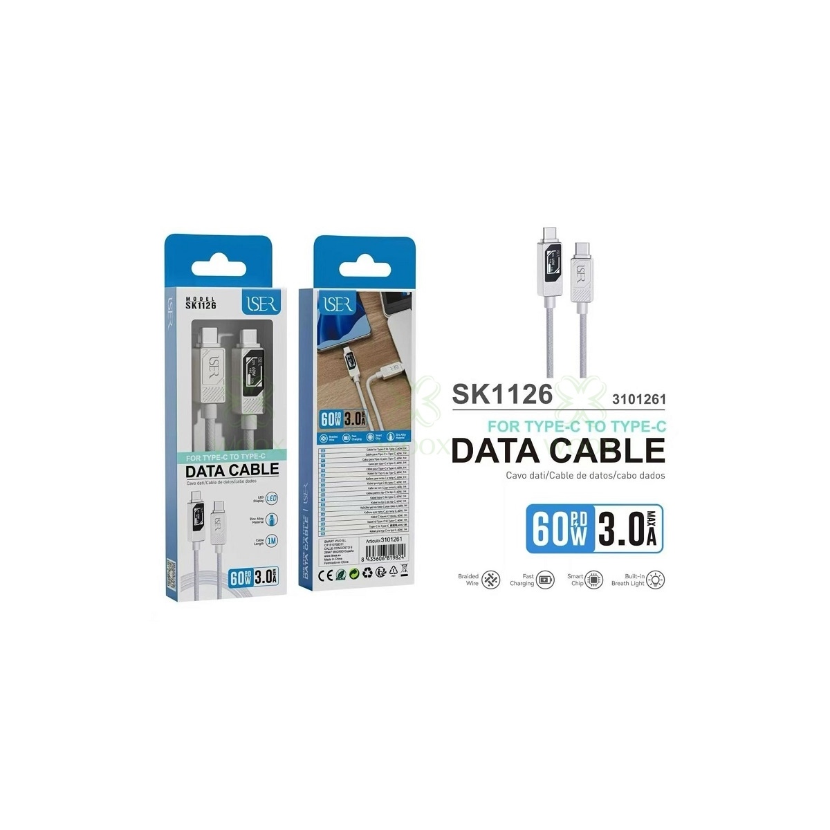 ISER SK1126 CABLE TRENZADO DE CARGA RAPIDA CON LED PD TYPE-C TO TYPE-C 60W 3.0A 1M BLANCO