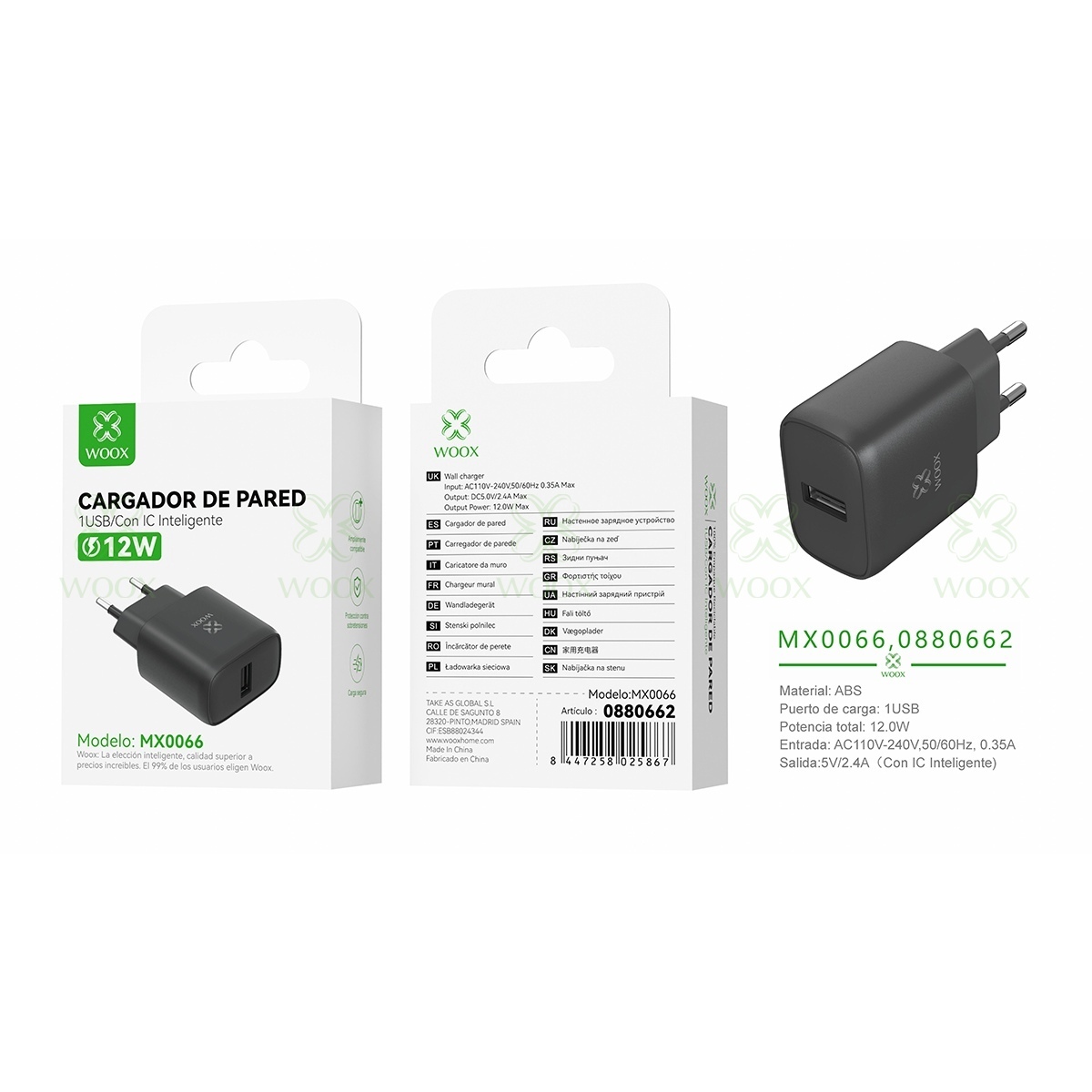 WOOX MX0066 EU SINGLE USB WALL CHARGER 5V/2.4A WITHOUT CABLE NEGRO