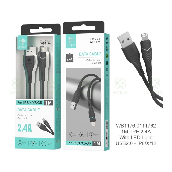 IKREA WB1176 CABLE DE DATOS TPE CON LUZ LED LIGHTNING 2.4A 1M NEGRO