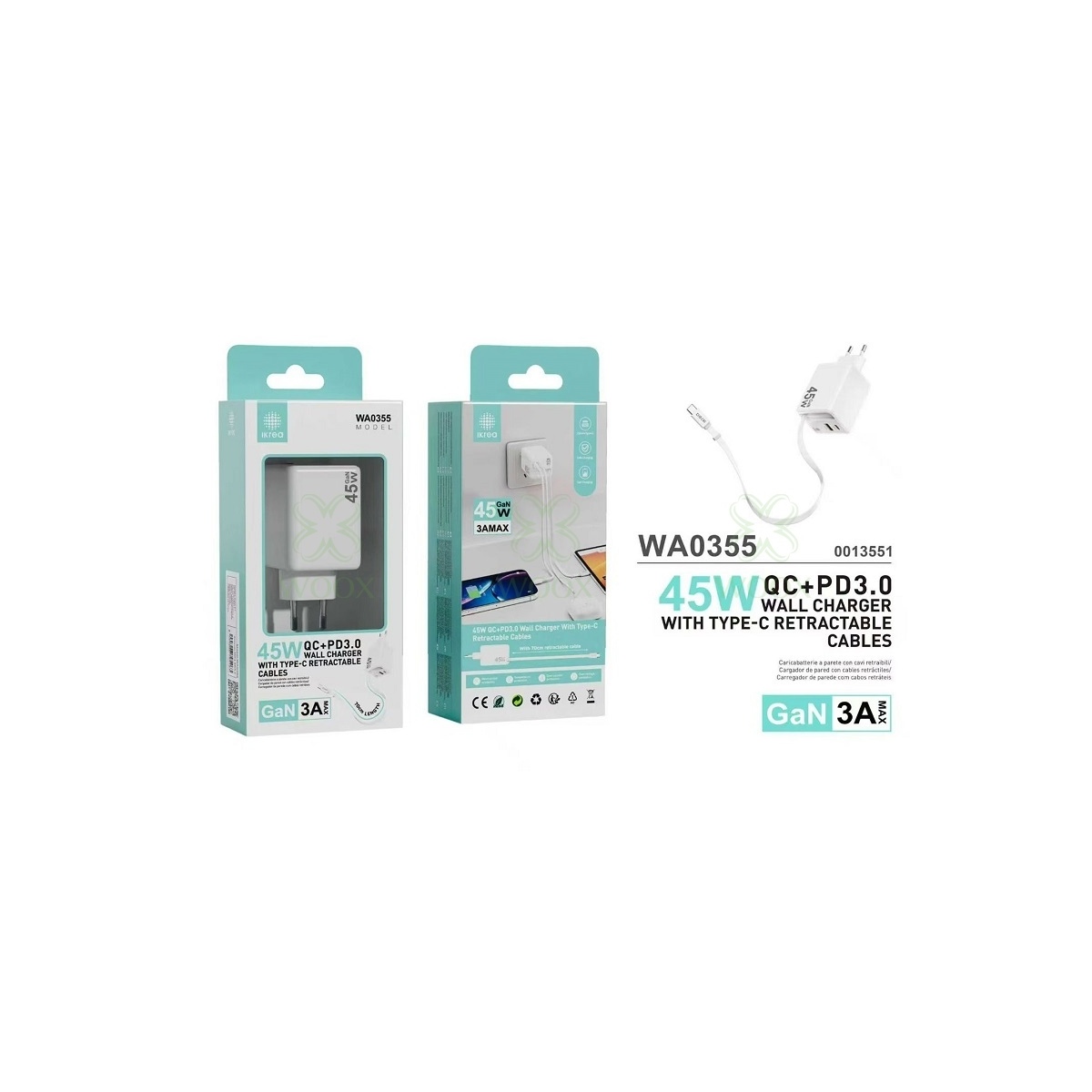 IKREA WA0355 CARGADOR 2 PUERTOS QC+PD3.0 CON CABLE TYPE-C RETRACTILES 45W GAN 3A MAX BLANCO