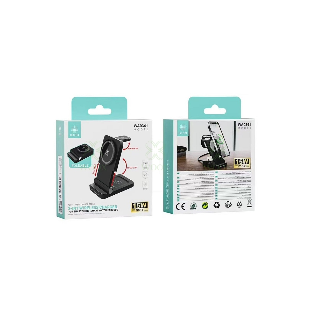 IKREA WA0341 CARGADOR INALAMBRICO PLEGABLE 3 EN 1 CON CABLE TYPE-C PARA MOVILES/AURICULARES/SMART WATCH 15W MAX NEGRO