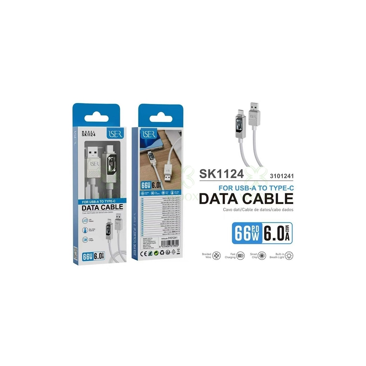 ISER SK1124 CABLE TRENZADO DE CARGA RAPIDA CON LED PD USB-A TO TYPE-C 66W 6.0A 1M BLANCO