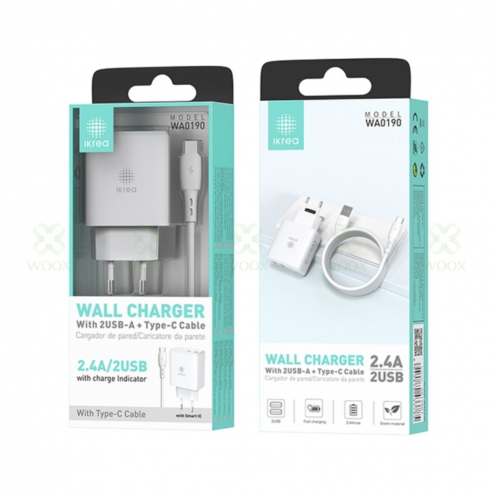 IKREA WA0190 CARGADOR SMART IC CON CABLE TYPE-C 2 PUERTOS 2.4A BLANCO