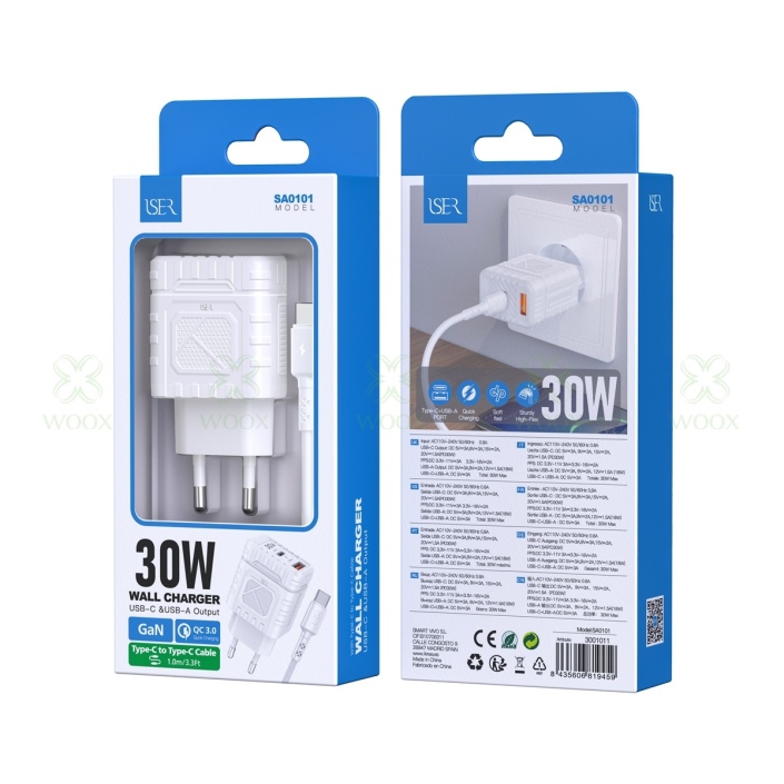 ISER SA0101 CARCADOR 2 PUERTOS QC3.0 TYPE-C/USB-A CON CABLE TYPE-C TO TYPE-C 30W BLANCO
