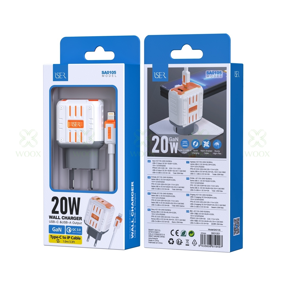 ISER SA0105 CARCADOR 2 PUERTOS QC3.0 TYPE-C/USB-A CON CABLE TYPE-C TO LIGHTNING 20W GRIS+NARANJA