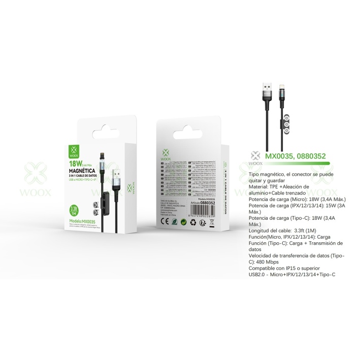 3 in 1 Magnetic Cable de Datos MX0035 USB to Micro+Type-C+ Lightning 3A 1m-Negro