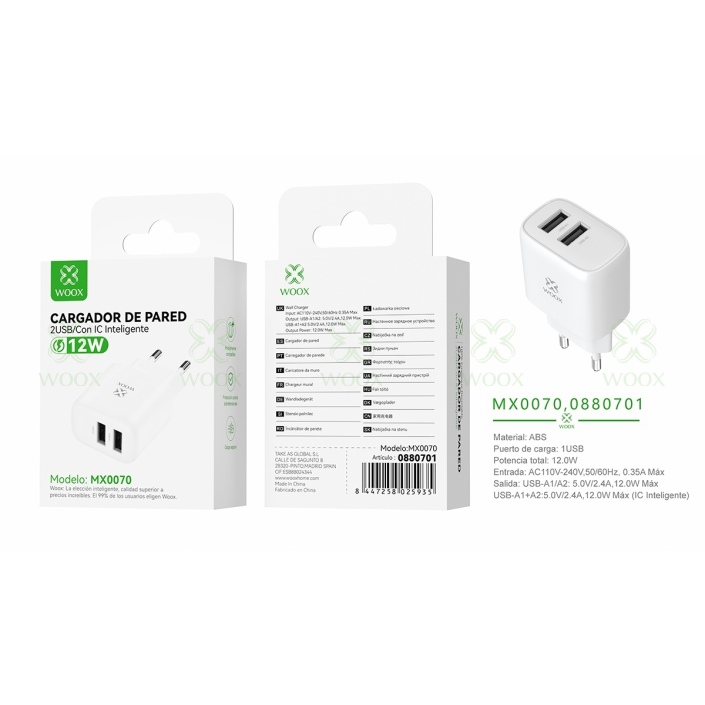 WOOX MX0070 ADAPTADOR DE 2 PUERTOS USB 12W BLANCO