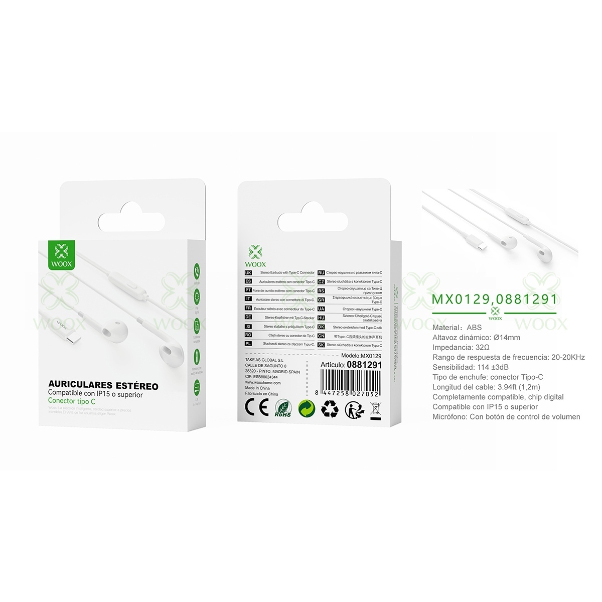 WOOX MX0129 AURICULARES CON CABLE COMPATIBLE TYPE-C (1,2M) BLANCO