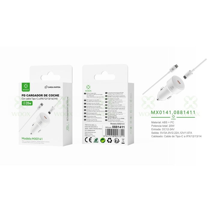 WOOX MX0141 CARGADOR CARGA RAPIDA PARA COCHE USB-C CON CABLE TYPE-C TO LIGHTNING (1M) 20W BLANCO