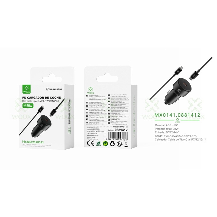 WOOX MX0141 CARGADOR CARGA RAPIDA PARA COCHE USB-C CON CABLE TYPE-C TO LIGHTNING (1M) 20W NEGRO