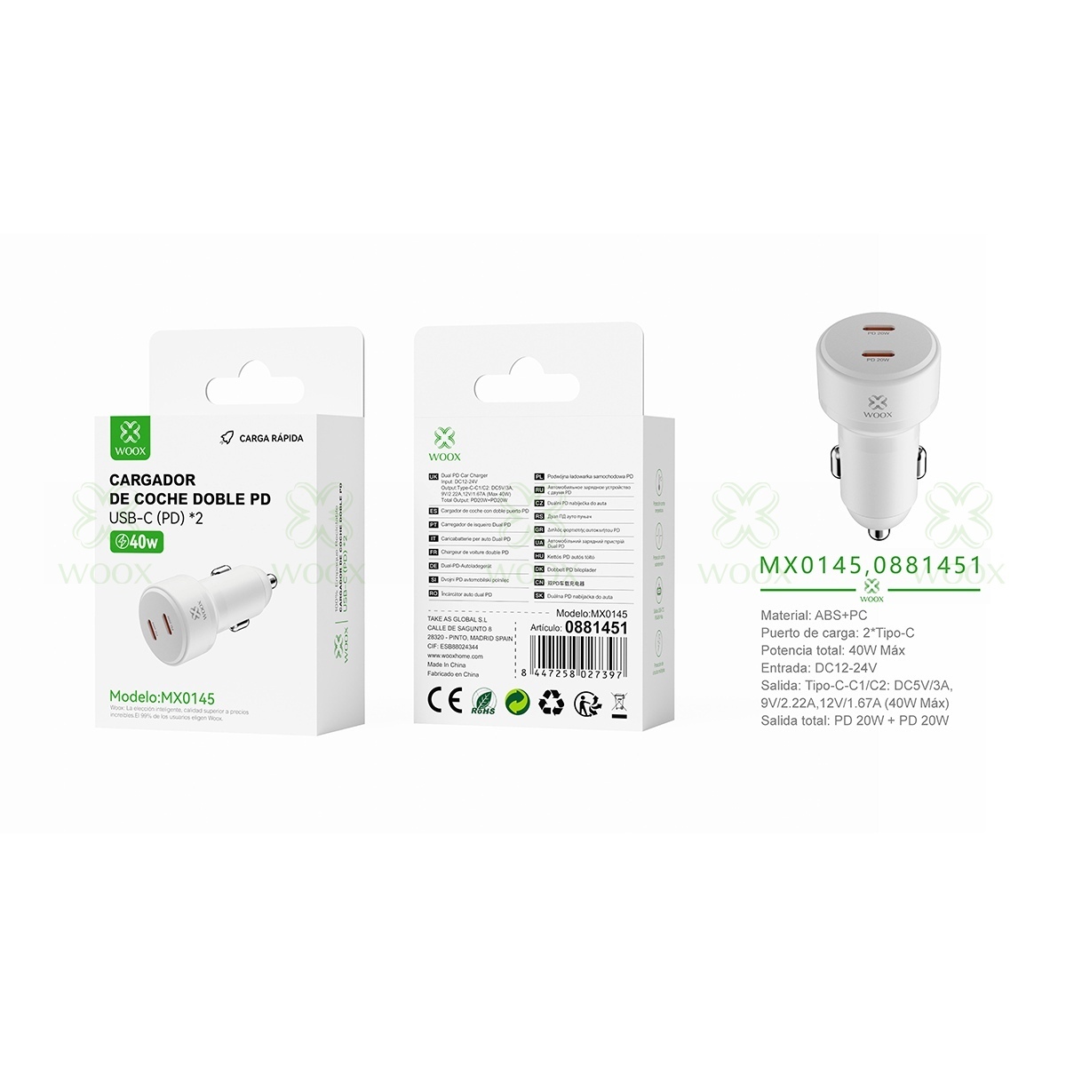 WOOX MX0145 CARGADOR CARGA RAPIDA PARA COCHE USB-C*2 40W BLANCO