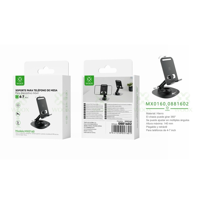 WOOX MX0160 SOPORTE DE METAL 4-7" 140MM 180º PLEGABLE Y RETRACTIL PARA MOVIL NEGRO
