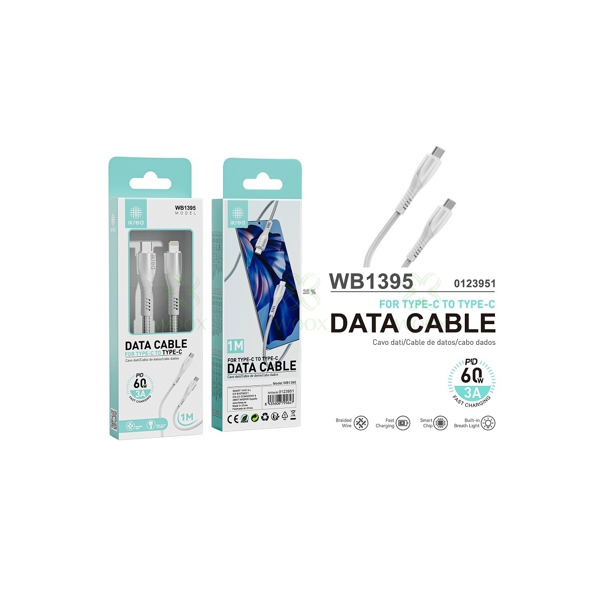 IKREA WB1395 CABLE TRENZADO DE CARGA RAPIDA PD TYPE-C TO TYPE-C 60W 3A MAX 1M BLANCO