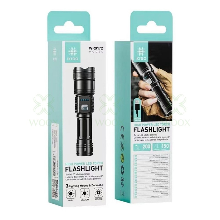 IKREA WR9172 LINTERNA DE ANTORCHA LED ALTA POTENCIA INTERFAZ USB 3 MODOS 200M 150 LUMENES